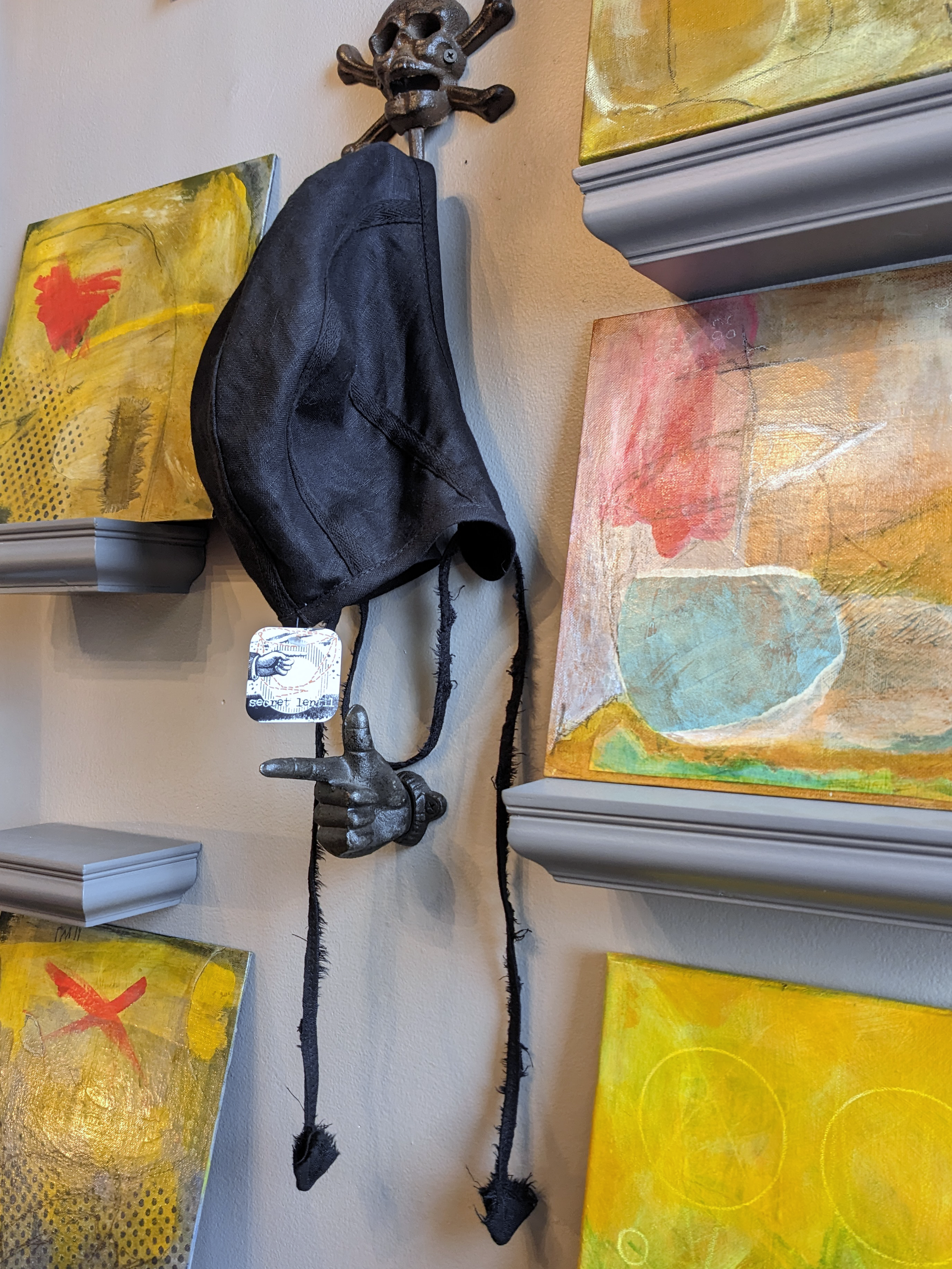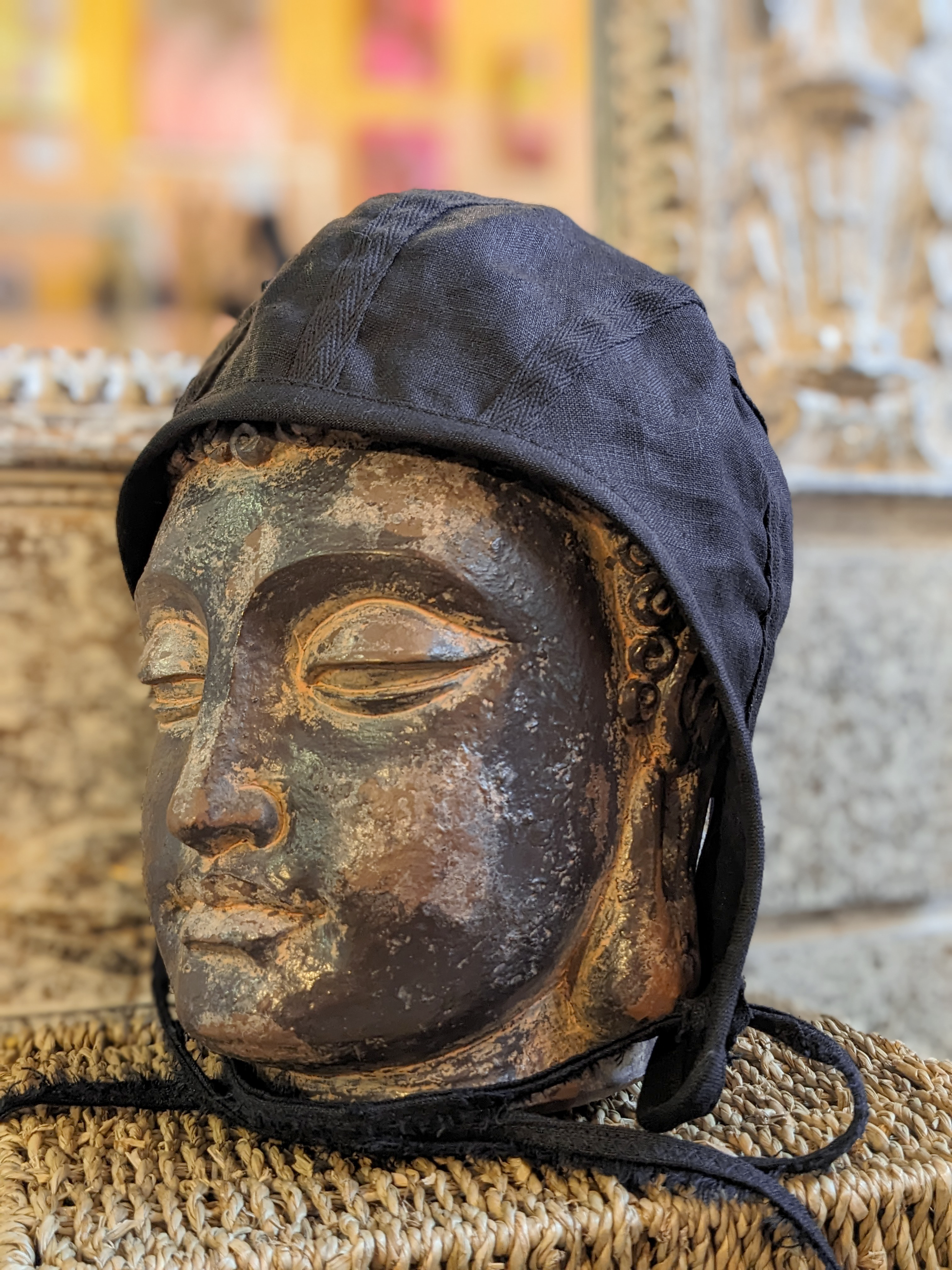 Moody black linen bonnet with dangly ties that run through the trimmed earflaps and under your chin. Tie them or let them dangle. All the seams are trimmed with cotton twill.