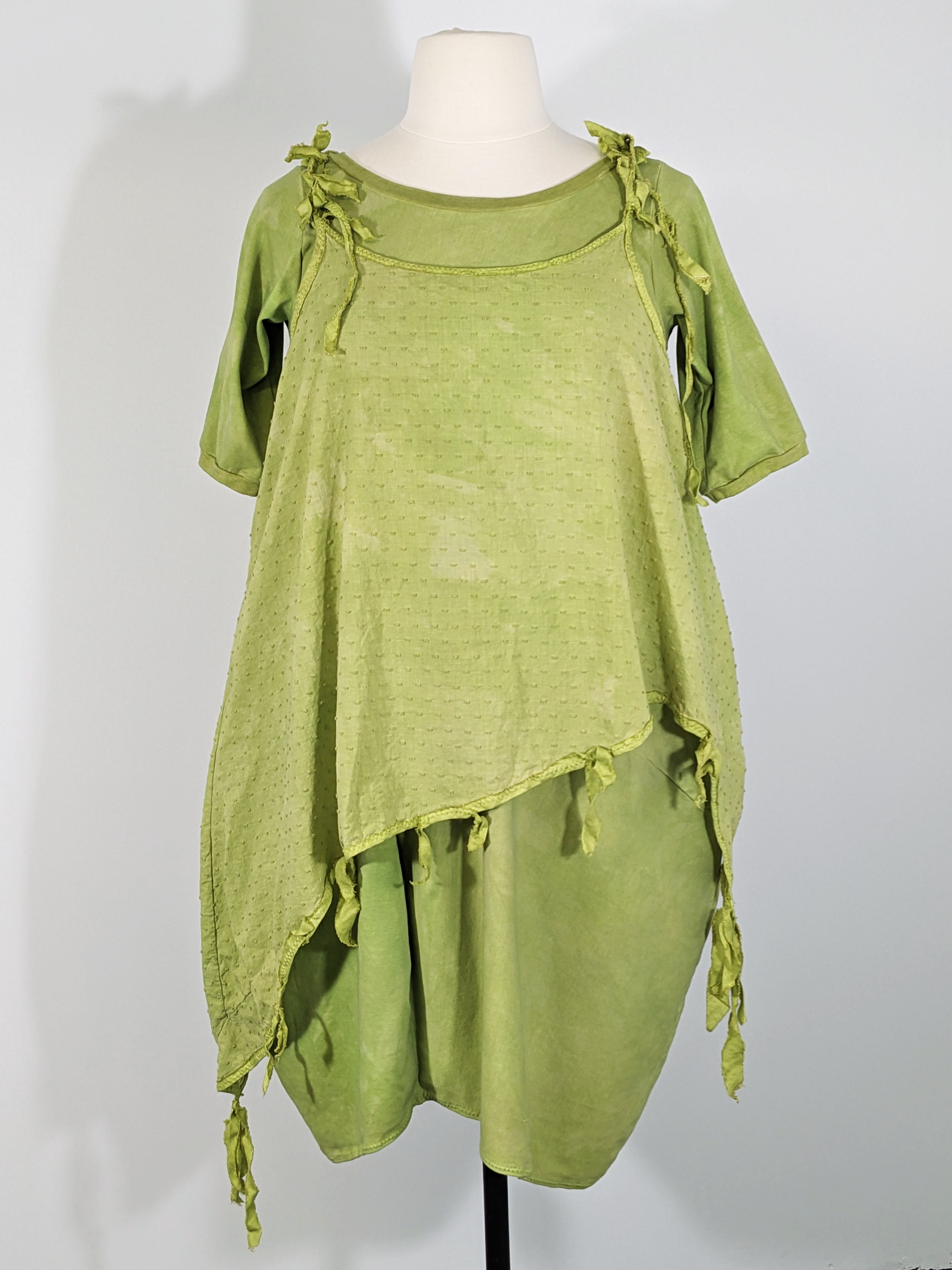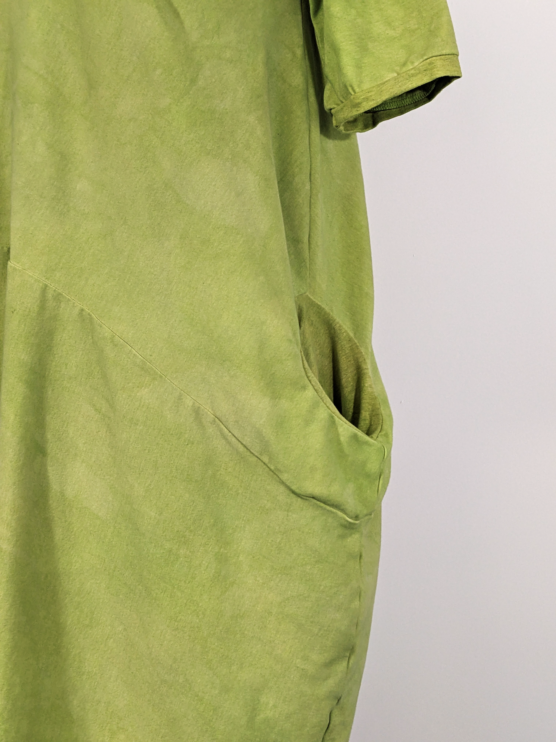 celerydress — mottled dyed bright chartreuse green dress with nice curves, asymmetric hem, a large side pocket, and elbow length sleeves. Shown solo and with the layering slip dress over it (listed separately.)