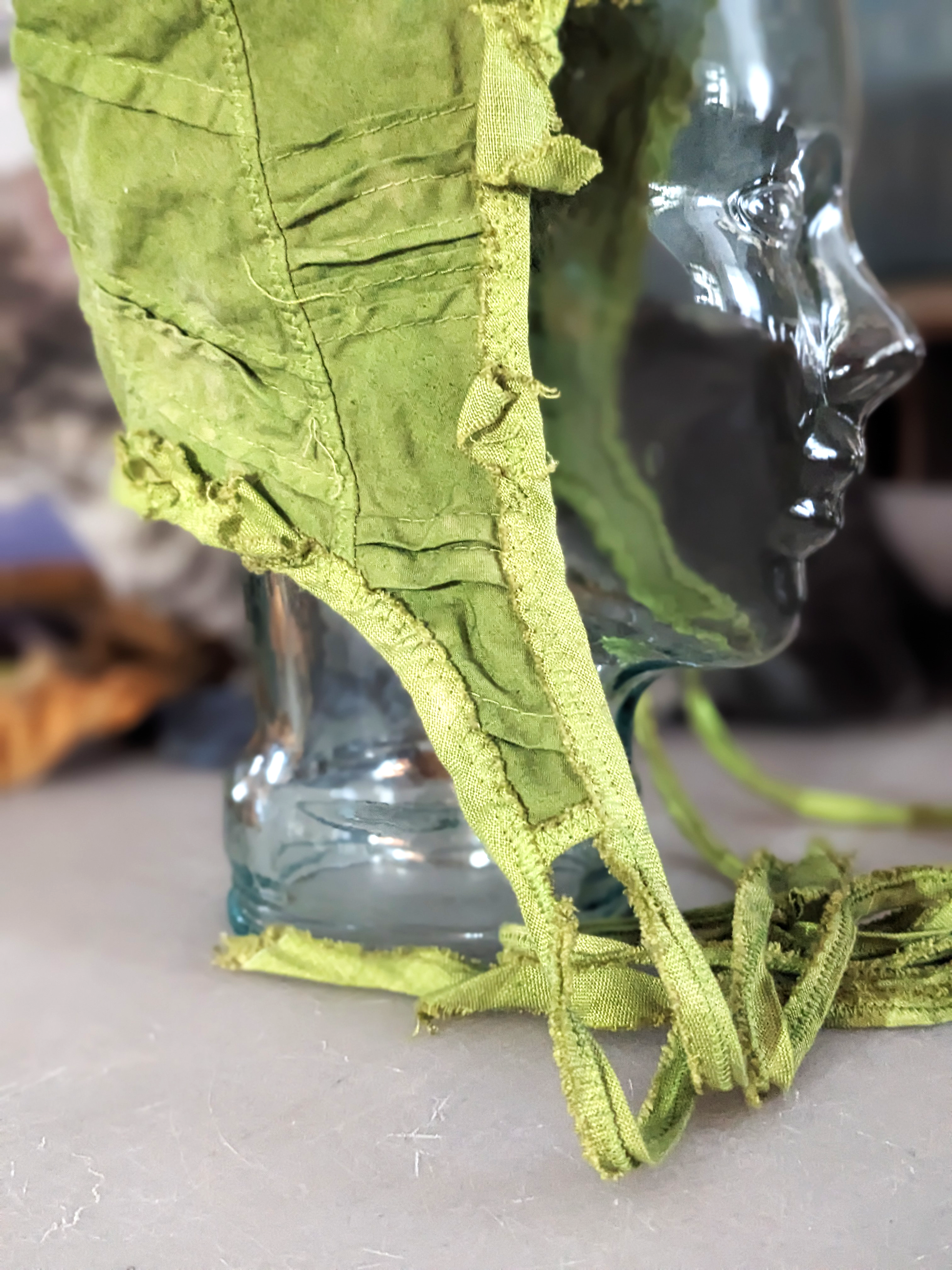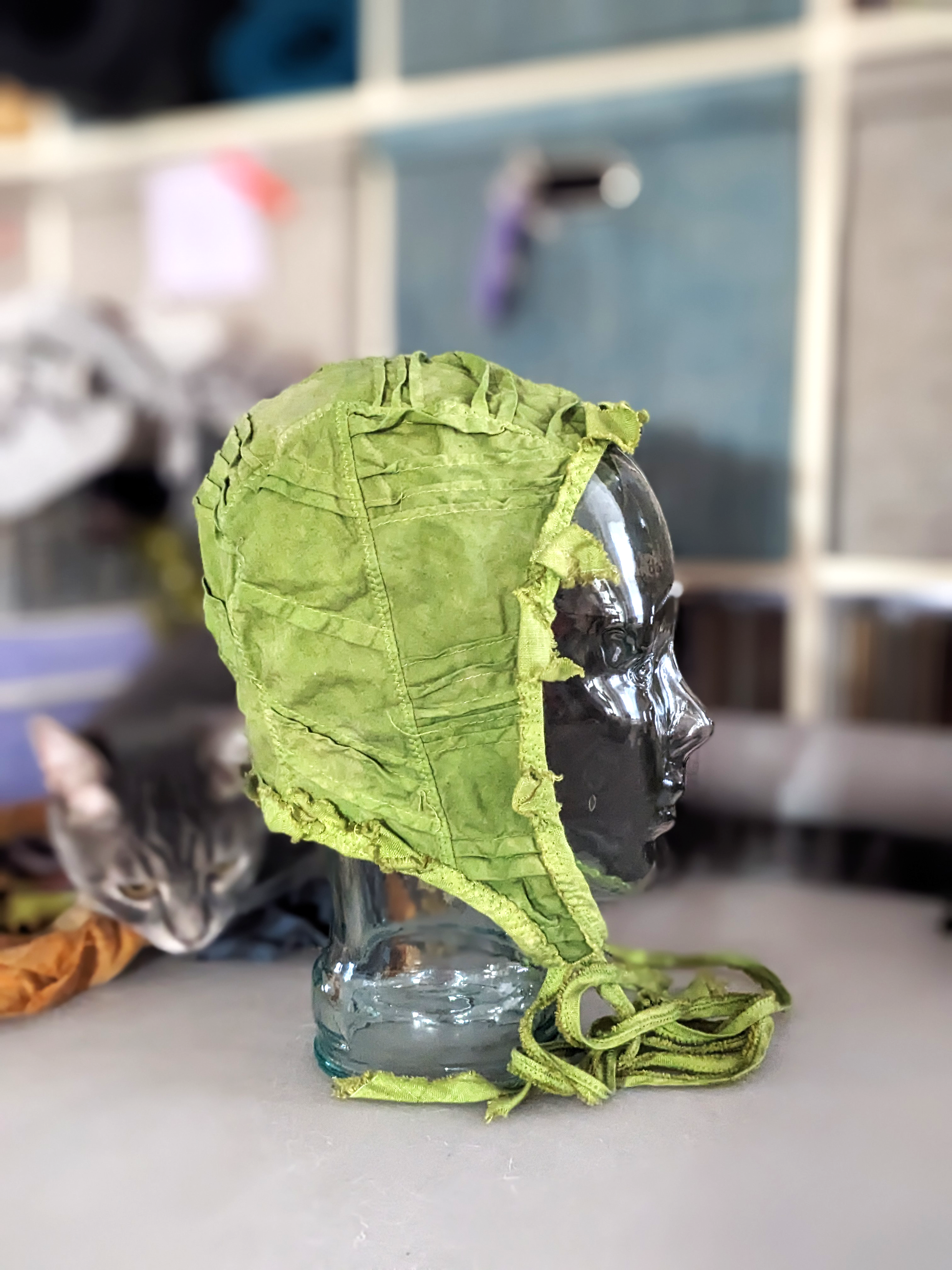 Bright vibrant green Summer-weight cotton aviator bonnet with a textured surface, scrappy trim, double ties on both sides, and, uhhh a large lurking kitten (not included.)