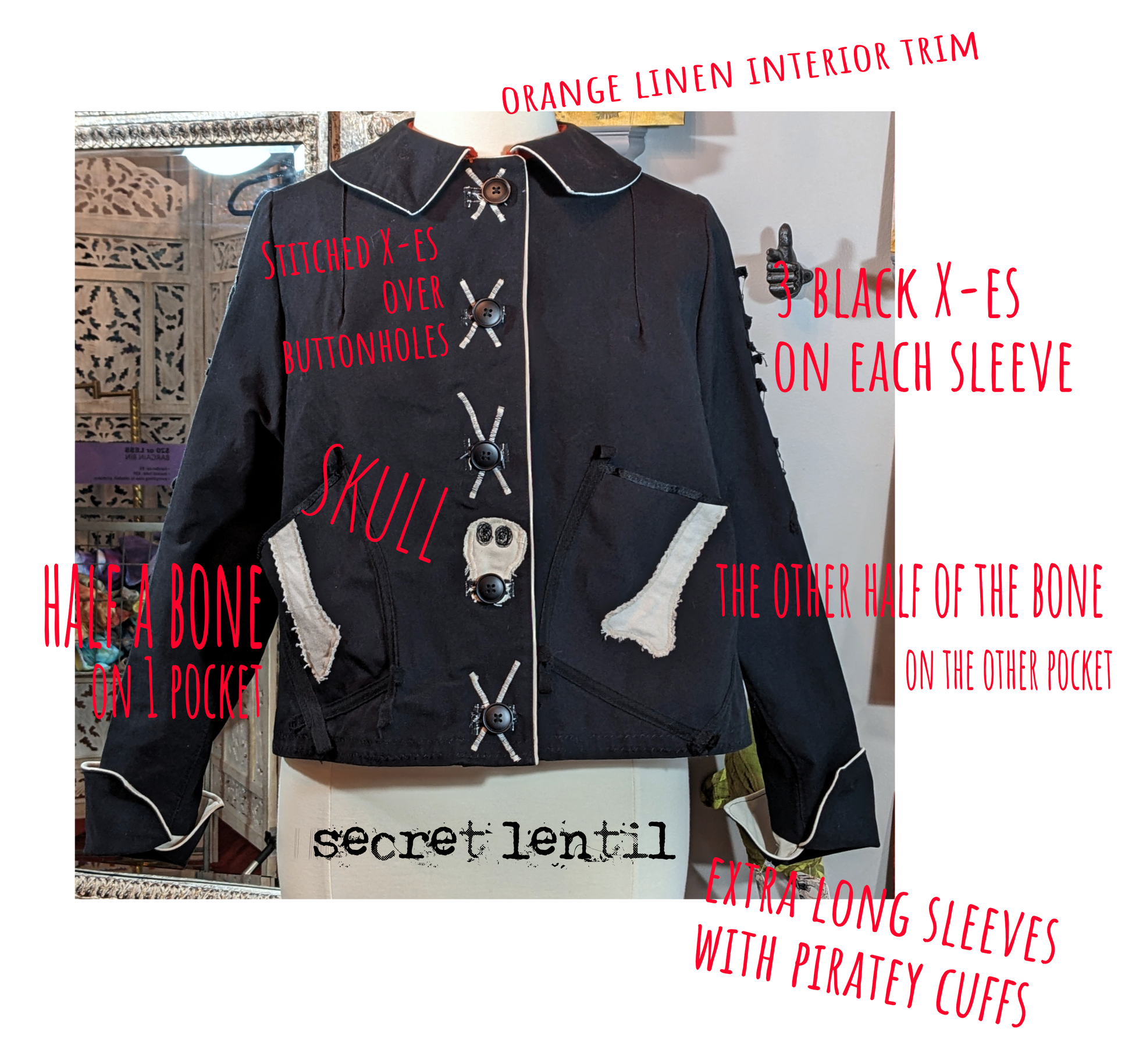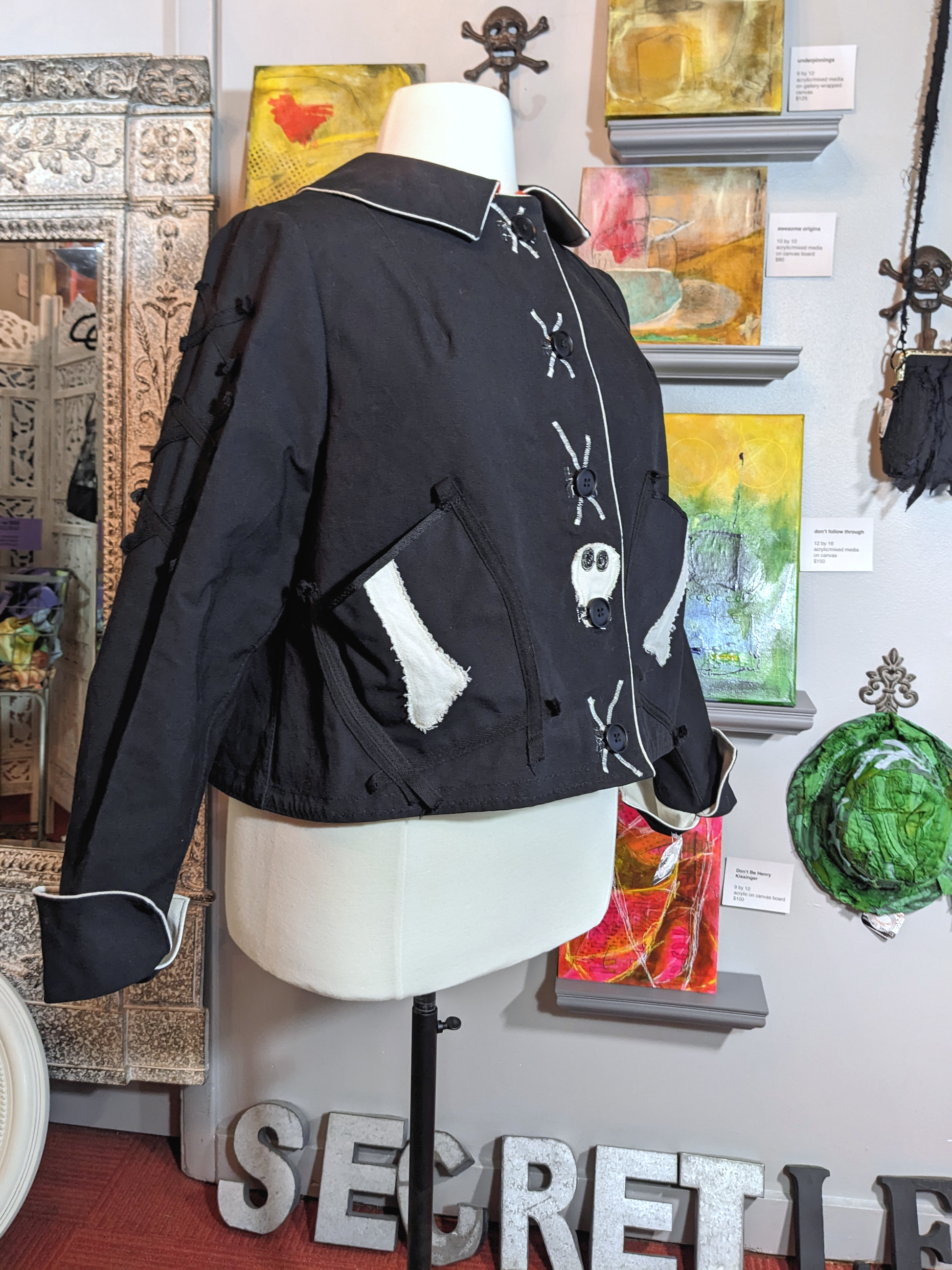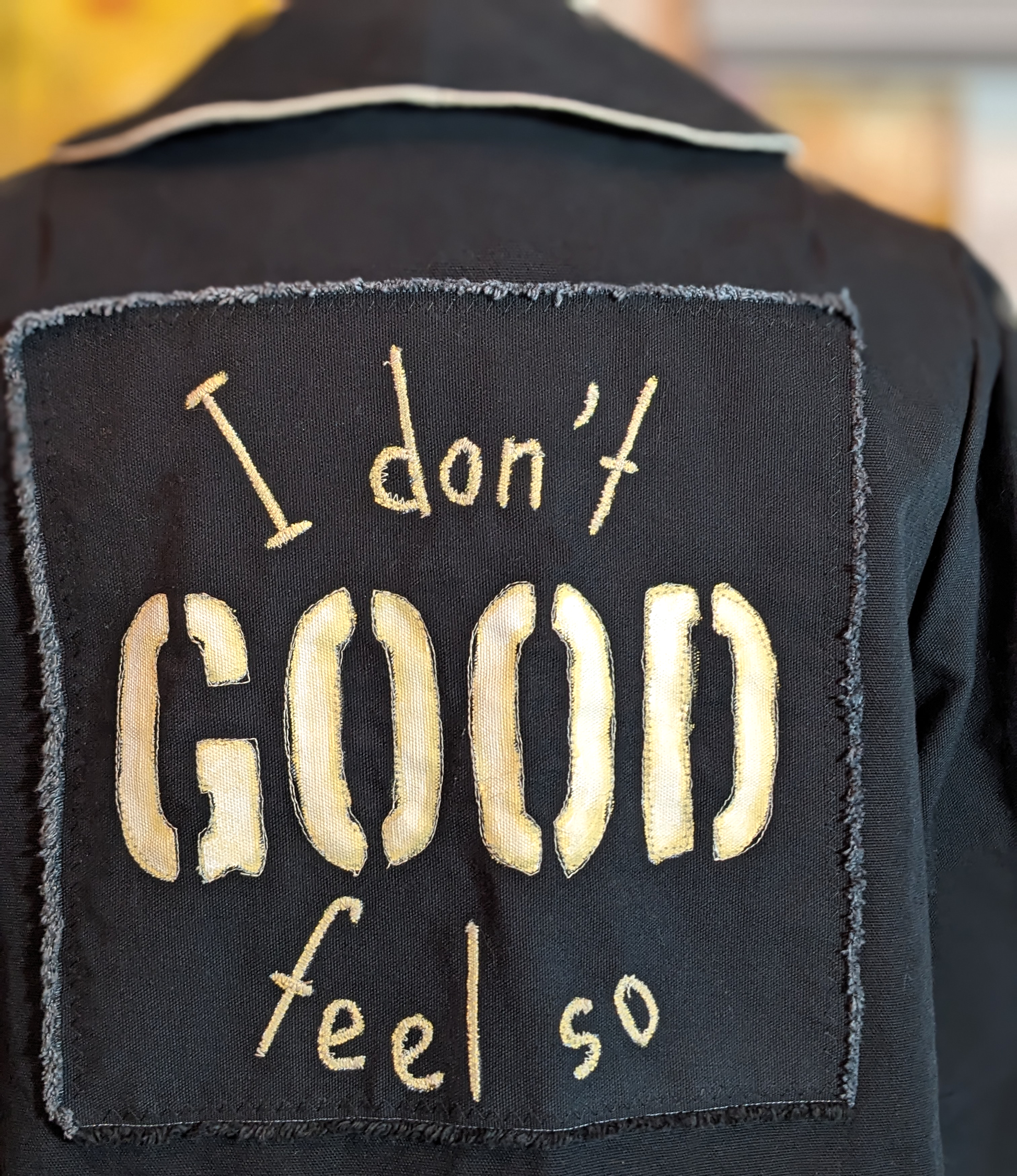 Sometimes you don't feel so good. I get it. Black canvas jacket with that exact special message on the back - in a combo of stitching and paint. Plus a whole bunch of other stuff that includes bones and a skull and other treats — see the annotated photo for a visual tour of all the details.